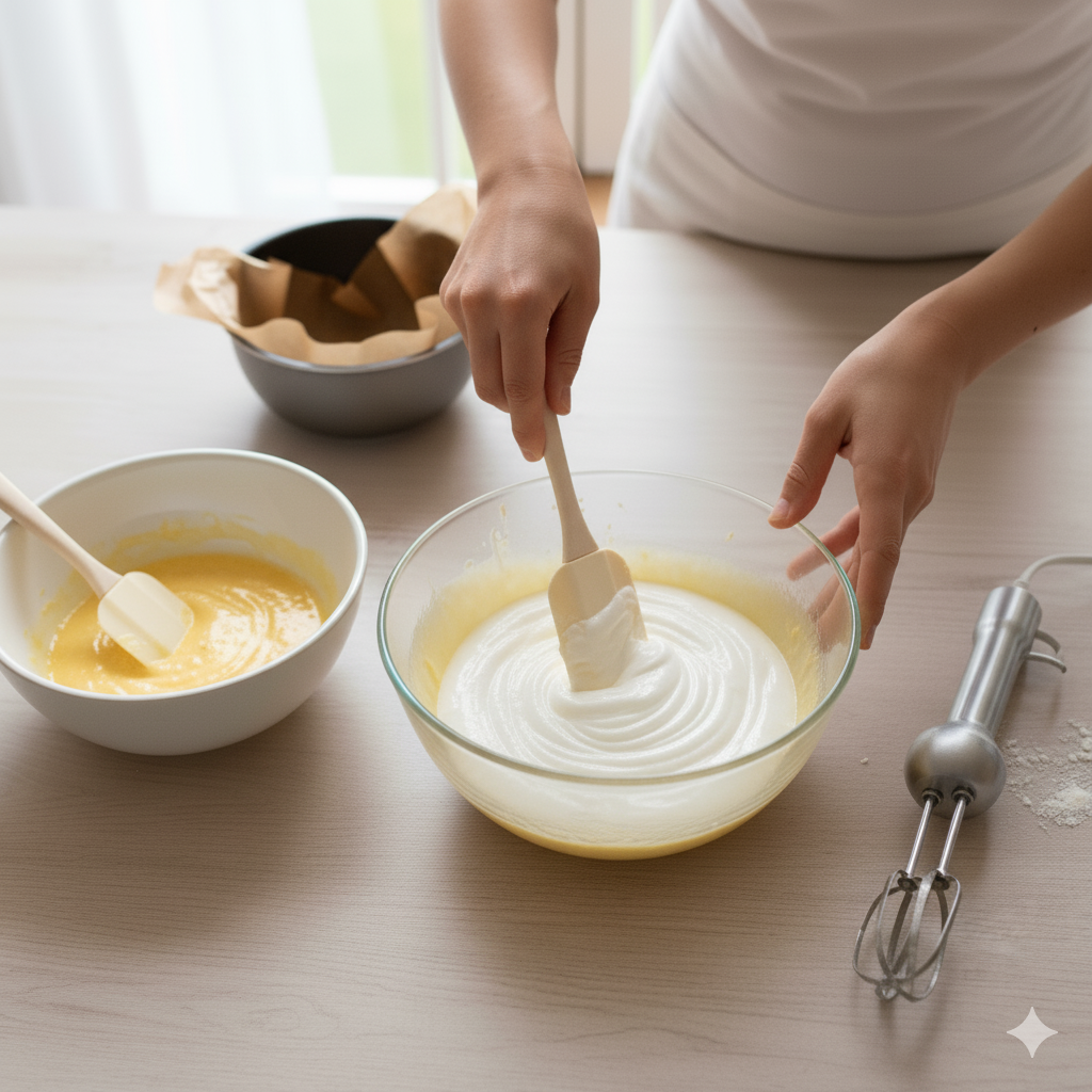 - Sử dụng kỹ thuật fold (cắt và hất) trộn nhẹ nhàng để hai hỗn hợp hòa quyện.
