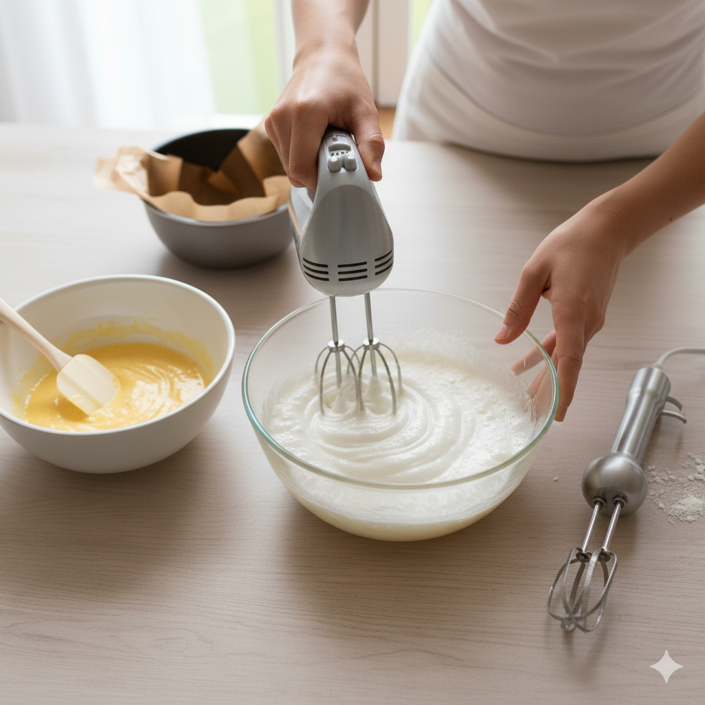 - Đánh đến khi lòng trắng bông cứng, tạo thành chóp nhọn (stiff peaks).