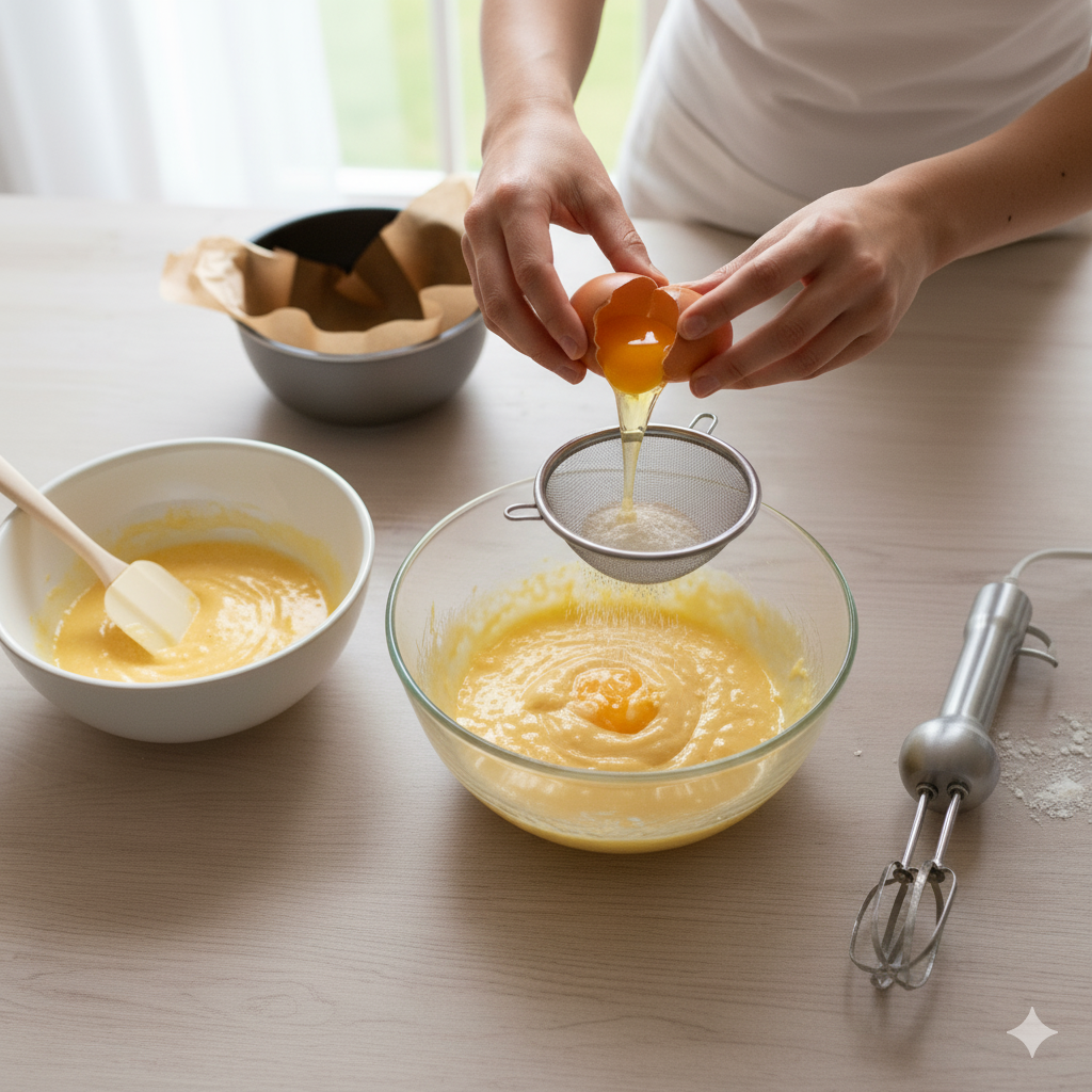 - Đổ hỗn hợp bột này vào phần lòng trắng còn lại và trộn nhẹ nhàng cho đến khi bột đồng nhất, không còn vân lòng trắng.